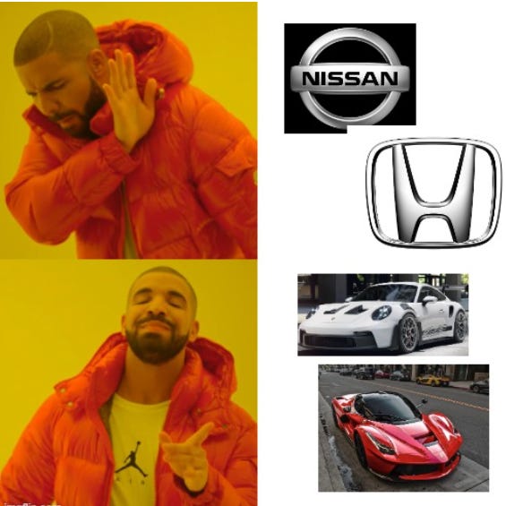 You're definitely not thinking of a Nissan or a Honda unless you're a car nut. Why would you?